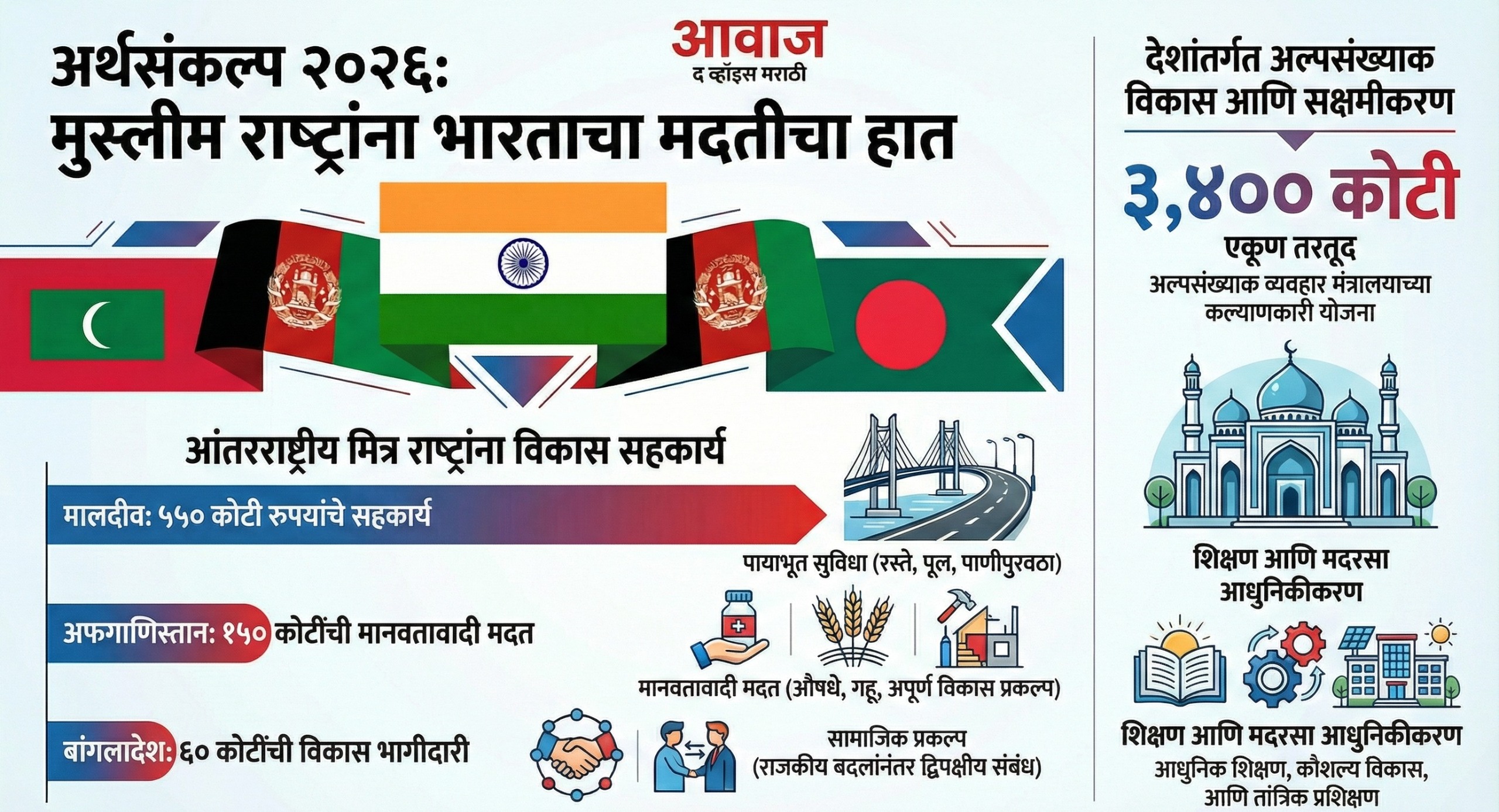 पंतप्रधान नरेंद्र मोदी यांच्या नेतृत्वाखालील केंद्र सरकारने २०२६-२७ या आर्थिक वर्षाचा अर्थसंकल्प सादर केला आहे. या अर्थसंकल्पात भारताने आपल्या शेजारील आणि मित्र राष्ट्रांना विकासासाठी मोठी मदत जाहीर केली आहे. यामध्ये अफगाणिस्तान, मालदीव आणि बांगलादेश यांसारख्या मुस्लीम बहुल राष्ट्रांचा समावेश असून, ही आकडेवारी भारताच्या समावेशक परराष्ट्र धोरणाचे दर्शन घडवते. ही मदत प्रामुख्याने मानवी विकास, शिक्षण, आरोग्य आणि पायाभूत सुविधांसाठी देण्यात येणार आहे.
