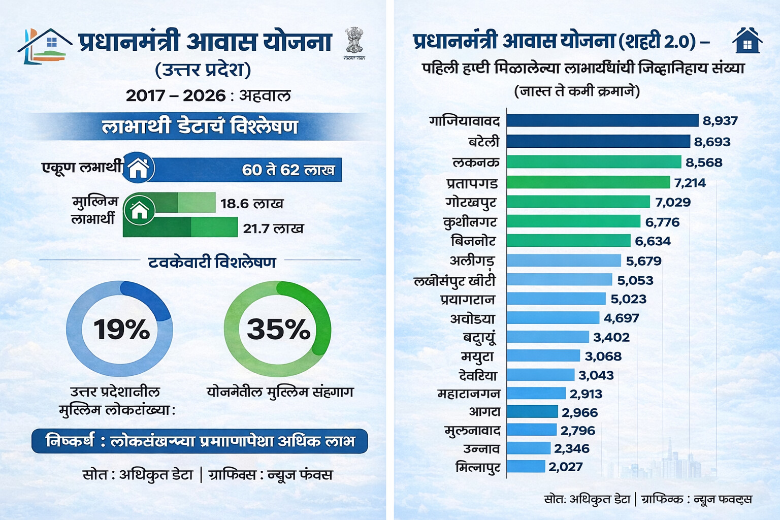 सरकारी आकडेवारीनुसार, मार्च २०१७ ते जानेवारी २०२६ या साडेआठ वर्षांत उत्तर प्रदेशात प्रधानमंत्री आवास योजनेअंतर्गत (ग्रामीण आणि शहरी) सुमारे ६० ते ६२ लाख कुटुंबांना पक्की घरे उपलब्ध करून देण्यात आली आहेत. मुख्यमंत्री योगी आदित्यनाथ यांनी सार्वजनिकरीत्या दावा केला आहे की, यापैकी सुमारे २१ लाख घरे मुस्लीम कुटुंबांना मिळाली आहेत. जरी अधिकृतपणे धर्मावर आधारित आकडेवारी उपलब्ध नसली, तरी मुख्यमंत्र्यांच्या विधानावरून विश्लेषण केल्यास या योजनेत मुस्लीम लाभार्थ्यांचा वाटा ३० ते ३५ टक्क्यांच्या दरम्यान आहे. ही आकडेवारी अत्यंत महत्त्वाची आहे कारण उत्तर प्रदेशच्या एकूण लोकसंख्येत मुस्लीम समुदायाचा वाटा सुमारे १८ ते १९ टक्के आहे.