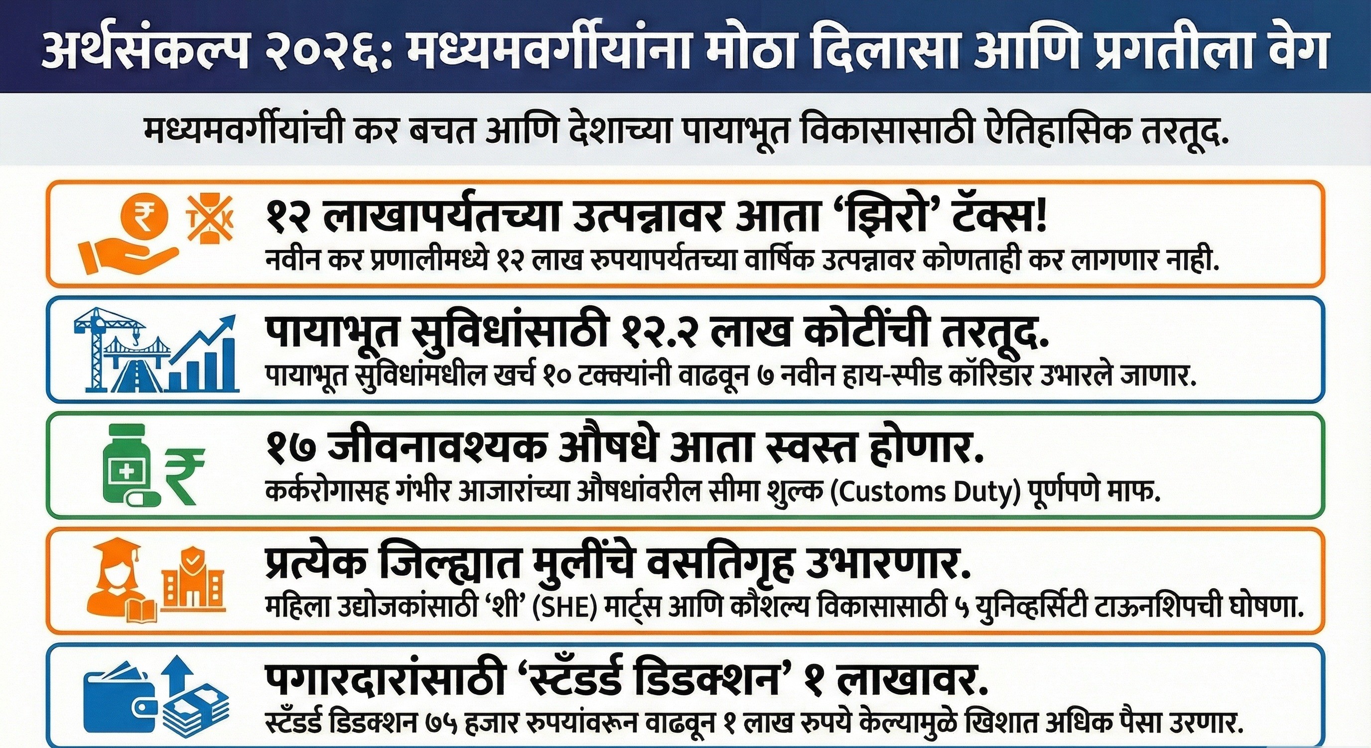 या अर्थसंकल्पाचा सर्वात मोठा आणि दिलासादायक भाग म्हणजे पगारदार वर्गासाठी जाहीर झालेली प्राप्तिकर सवलत. अर्थमंत्र्यांनी नवीन कर प्रणाली अधिक आकर्षक करताना १२ लाख रुपयांपर्यंतच्या वार्षिक उत्पन्नावर कोणताही कर लागणार नाही, अशी घोषणा केली आहे. यापूर्वी ही मर्यादा सवलतींसह ९.५ लाख रुपयांपर्यंत होती. यासोबतच, पगारदार कर्मचाऱ्यांसाठीचे 'स्टँडर्ड डिडक्शन' ७५ हजार रुपयावरून वाढवून आता १ लाख रुपये करण्यात आले आहे. यामुळे मध्यमवर्गीयांच्या खिशात अधिक पैसा उरणार असून नवीन टॅक्स स्लॅबनुसार आता ३० टक्के कर केवळ २४ लाखांच्या पुढील उत्पन्नावर लागू होईल.