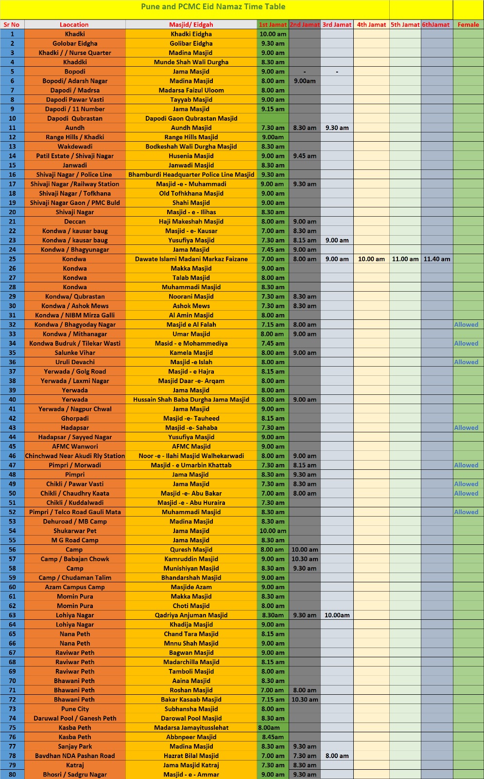 समाजात एकता, सौहार्द आणि समानतेचा संदेश देणारी ही ईद सर्वांनी शांततेत आणि आनंदात साजरी करावी, असे आवाहन प्रशासनाकडून करण्यात येत आहे. खालील वेळापत्रकानुसार पुणे आणि पिंपरी-चिंचवडमधील प्रमुख मशिदींमध्ये ईदची नमाज अदा करण्यात येईल. नागरिकांनी कृपया दिलेल्या वेळेनुसार संबंधित मस्जिदीत उपस्थित राहावे.