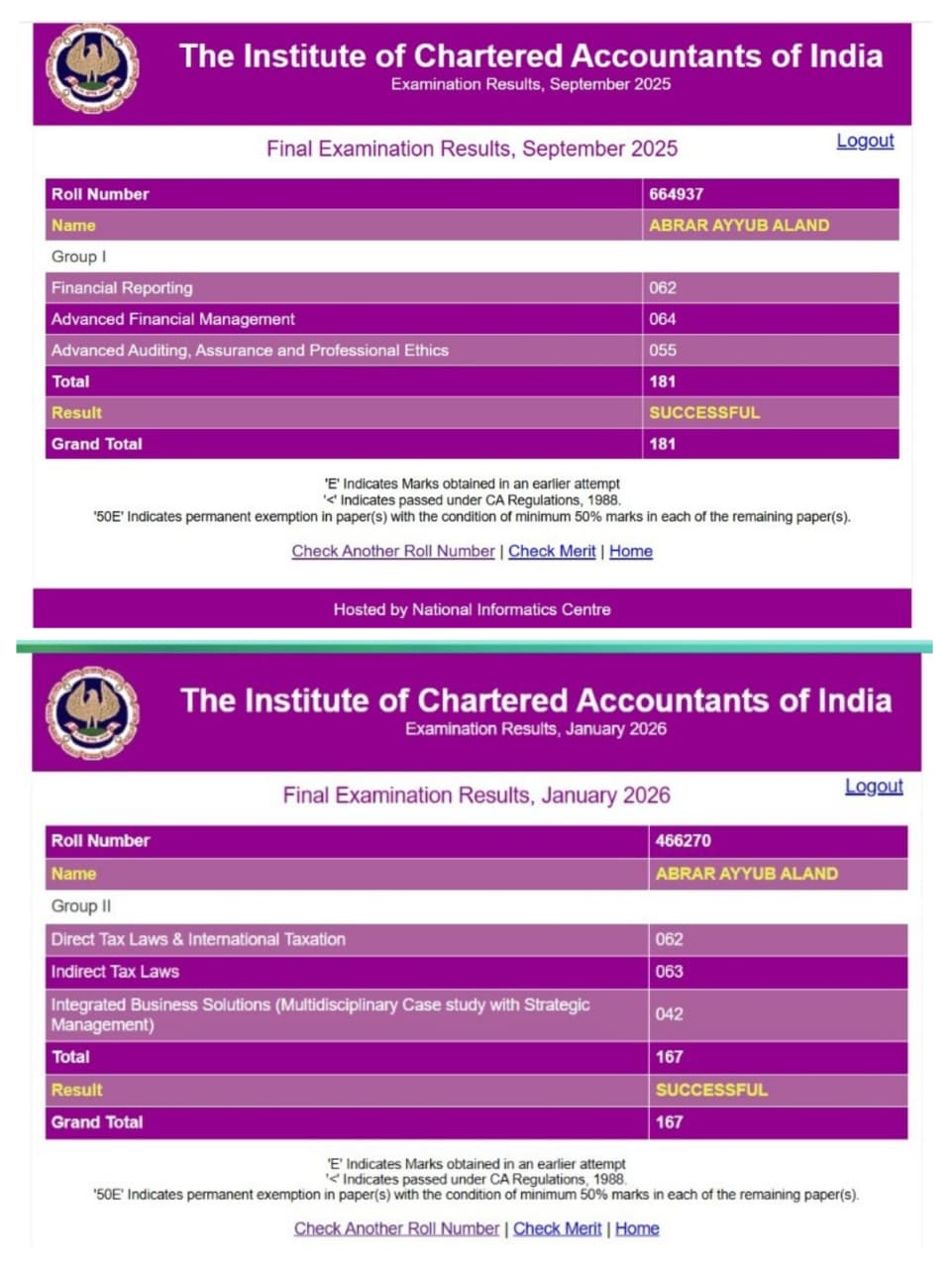 देशातील अत्यंत कठीण समजल्या जाणाऱ्या चार्टर्ड अकाउंटंट परीक्षेचा निकाल १ मार्च २०२६ ला जाहीर झाला. या निकालामध्ये अबरार आळंद याने भरघोस यश मिळवले. अबरार म्हणतो, "निकाल जाहीर झाला त्यावेळी मला माझा भाऊ वसीम आळंद यांचा फोन आला आणि त्यांनी आनंदाने म्हटले की, हॅलो CA अबरार अय्युब अलंद, तुम्ही पास झाला आहात! त्यावेळचा माझा आनंद शब्दांत मांडता येणारा नव्हता.”